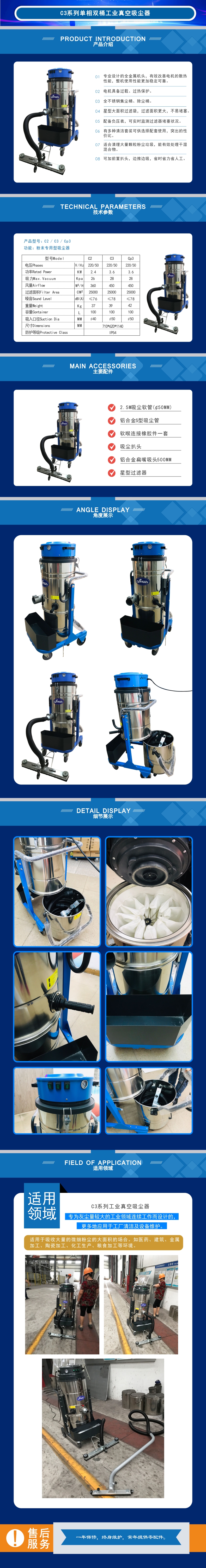 C3係列工業真空吸塵器專為灰塵量較大的工業(yè)領域連(lián)續工(gōng)作而設計(jì)的,更多地應用於工廠清潔及設備維護適用(yòng)於(yú)吸收大量的微細粉塵的大麵積的場合。如醫藥、建築、金屬加工、陶瓷加(jiā)工、化工生(shēng)產、糧食加工等環境。