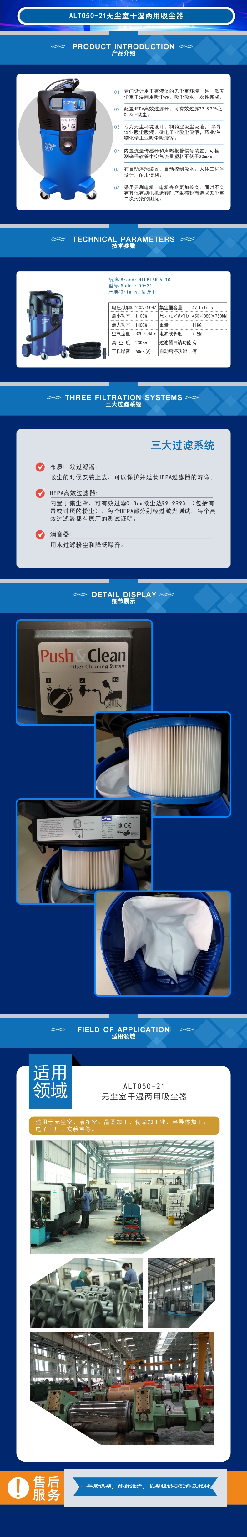 1. 專門設計用於有液(yè)體的無塵室環境。是一款無塵(chén)室幹濕兩用(yòng)吸塵器,吸塵吸水一次性完成。