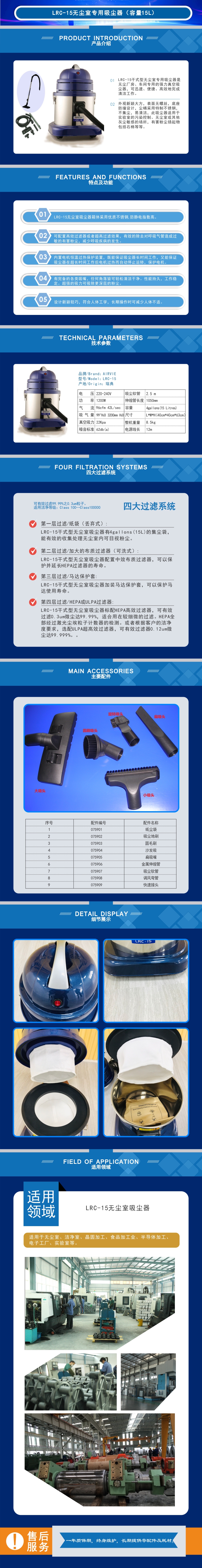 LRC-15幹式型無塵室吸塵器有4gallons(15L)的集塵(chén)袋,能收集處理無塵室內可目視粉塵。